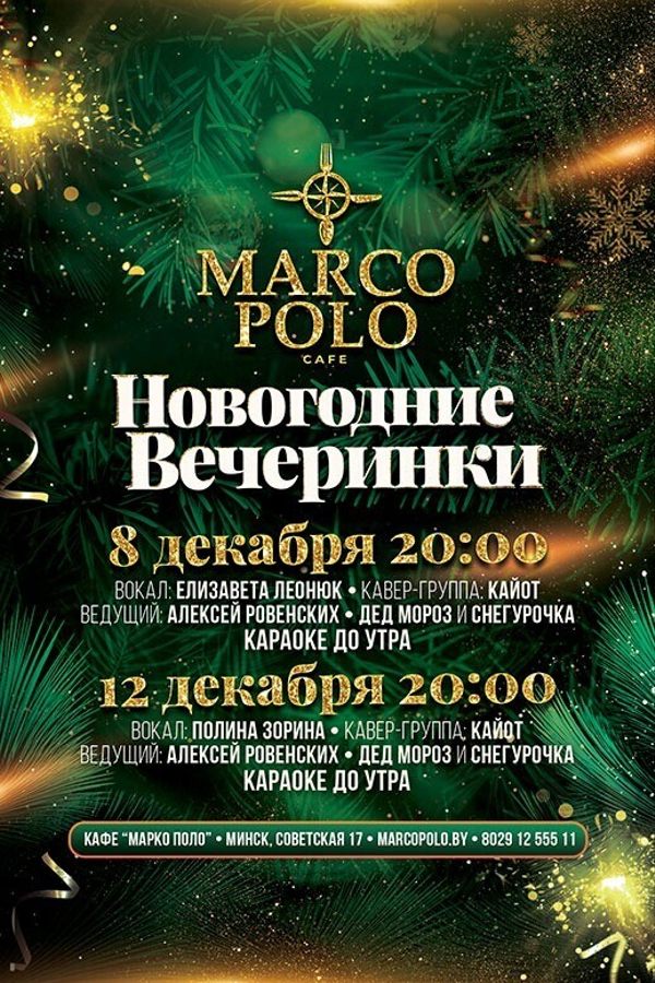 Приглашаем на незабываемые Новогодние вечеринки в кафе Марко Поло! Вкусные блюда, шоу с живой музыкой и ведущим, а встреча с Дедом Морозом и Снегурочкой сделают ваш вечер по настоящему волшебным. Завершим ваш праздник любимыми песнями в караоке до утра!