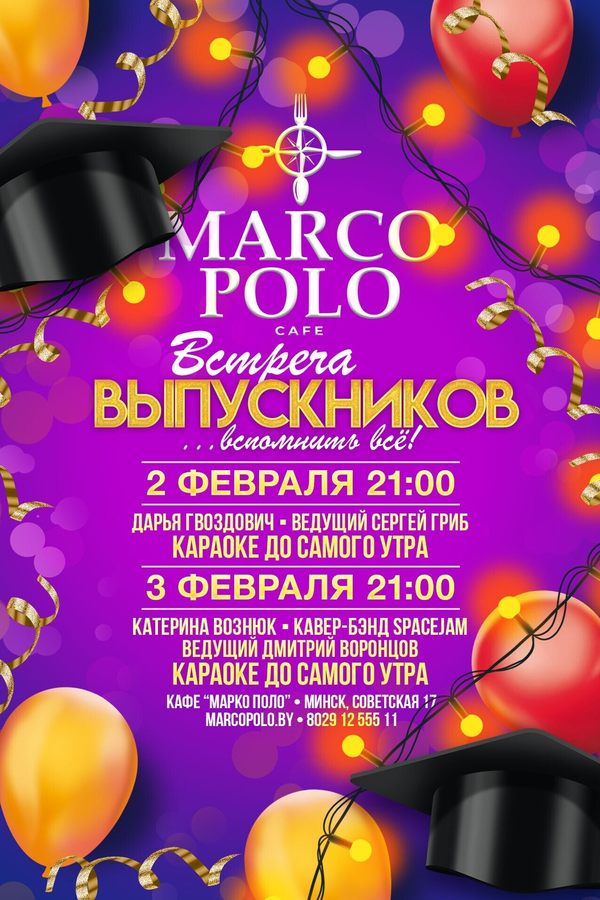 Встреча выпускников в кафе Марко Поло — это эмоции которые нельзя упустить! Возможность встретиться с друзьями детства и вспомнить о беззаботных годах учёбы. Звони своим ребятам из «прошлого» и вместе сделайте этот вечер незабываемым в кафе Марко Поло!