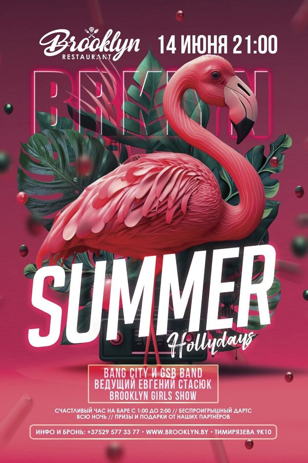 Получите незабываемые эмоции на вечеринке Summer Hollydays: наслаждайтесь вкусной едой, любимыми напитками и внимательным обслуживанием! Каждые выходные мы приглашаем кавер-бенды и зажигательных ведущих для того, чтобы ваша ночь стала по-настоящему незабываемой! Ждём вас в ресторане Бруклин!