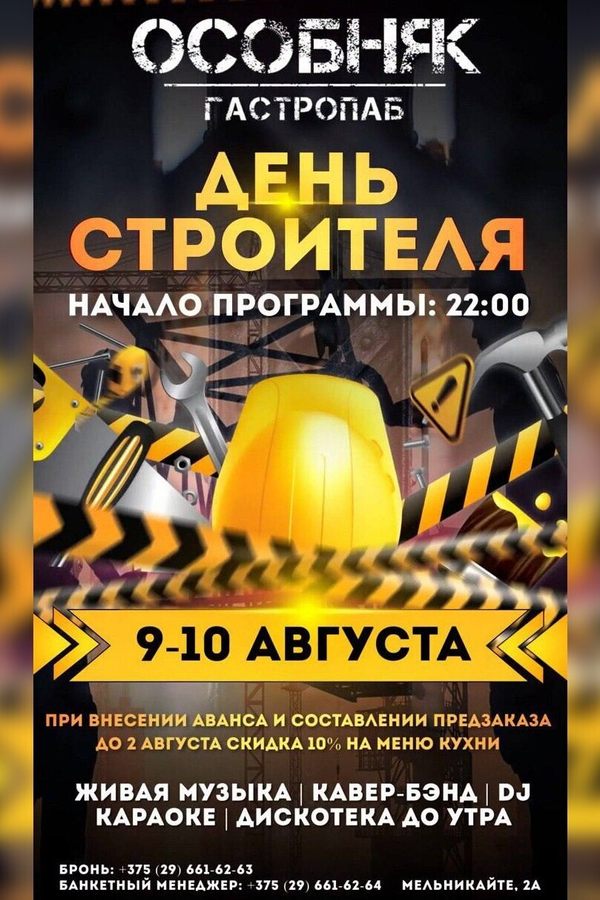 Дорогие строители, в честь вашего профессионального праздника мы подготовили особое предложение. Проведите незабываемый вечер в нашем новом трехэтажном гастропабе!