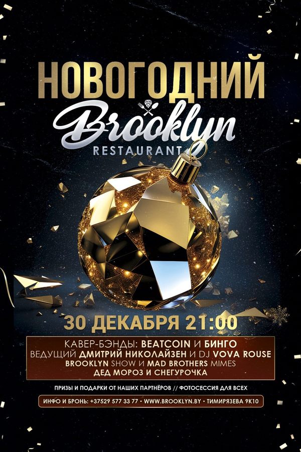 Новый год — это время для веселья и радости! Приглашаем вас в ресторан Бруклин, где можно отдохнуть от повседневной суеты и зарядиться новогодним настроением с друзьями. Ждём вас!