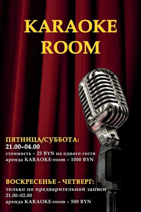 пт.-сб.: 25,00 руб. на одного гостя, аренда Karaoke-room — 1000,00 руб.