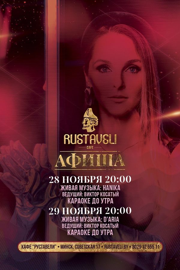 Проведите вечера с уютом грузинского кафе Руставели, где вас ждут любимые блюда, разнообразие напитков, шоу-программа с живым звуком от талантливых артистов, а затем окунитесь в мир караоке и веселья до утра! До встречи в Руставели!