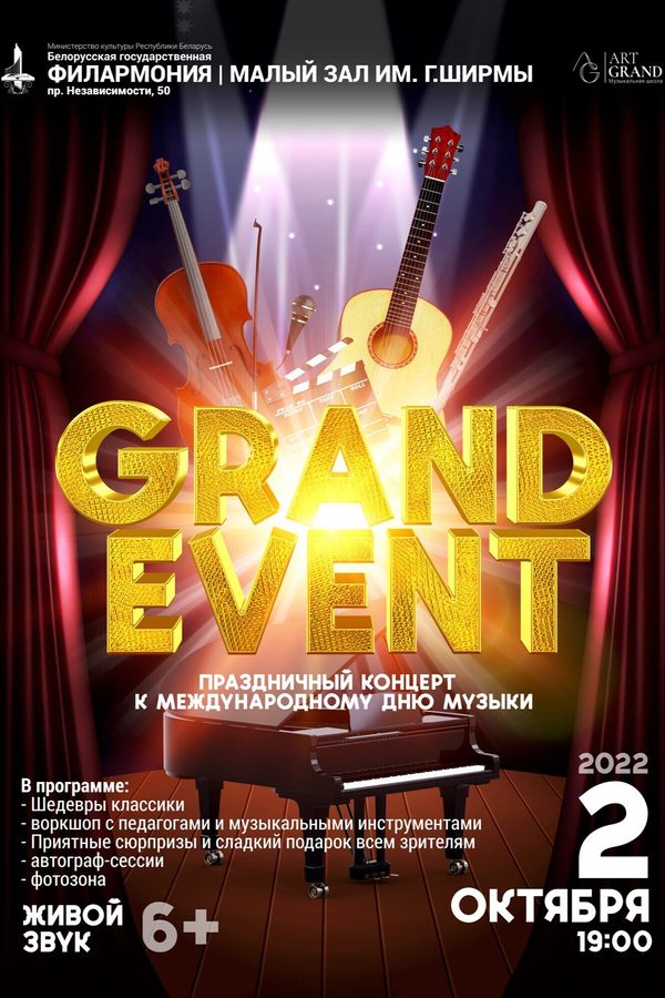 Истинным подарком к Международному дню музыки для минчан станет концерт «Гранд-эвент» Музыкальной школы АртГранд. Трогательную и чувственную музыку Коччанте, Сартори, Э. Джона и других современных композиторов исполнят виртуозные музыканты, лауреаты международных конкурсов, талантливые педагоги Музыкальной школы АртГранд. В их исполнении прозвучат композиции из фильмов «Игра престолов», «Король лев», мюзикла «Нотр Дам Де Пари» и др.