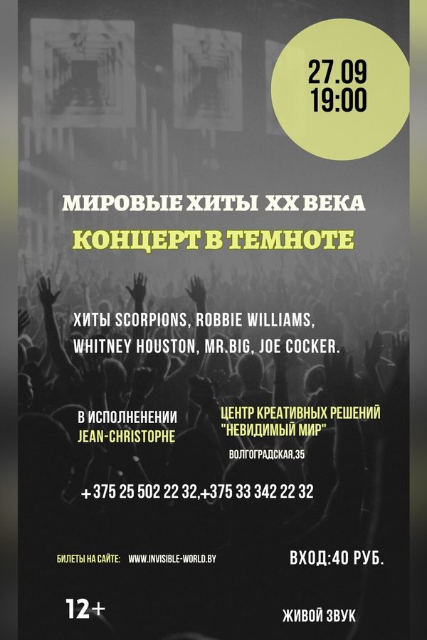 Мы исполним для вас самую лучшую музыку — Eagles, Gary Moore, Bob Dylan, Eric Clapton, Queen и многие другие исполнители стали уже легендами, и мы сможем прикоснуться к их гениальности на нашем концерте, который проходит в полной темноте.