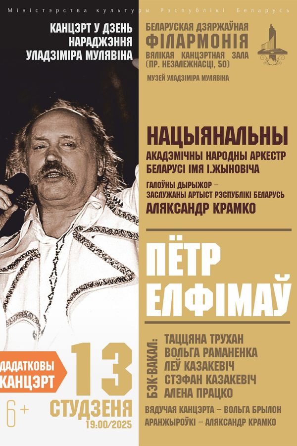 На этот раз в рамках «Концерта в день рождения Владимира Мулявина» (а именно такое название этого ежегодного проекта) 12 января на сцене Большого концертного зала филармонии состоится сольный концерт Петра Елфимова, который в сопровождения Национального академического народного оркестра Республики Беларусь им. И.И.Жиновича под управлением заслуженного артиста Республики Беларусь Александра Кремко исполнит известные песни из творческого наследия Владимира Мулявина и ансамбля «Песняры». Среди них — «Александрына», «Зачарованная», «Наши любимые», «Мой родны кут», «Жураўлі на Палессе ляцяць», «Вераніка», «Чырвоная ружа» и др.