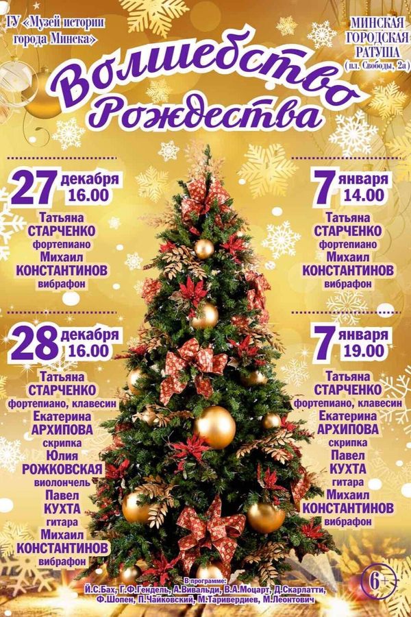 Музей истории города Минска и художественный руководитель «Музыкальной гостиной» Татьяна Старченко представляют праздничную музыкальную программу «Волшебство Рождества». Концерты состоятся 27, 28 декабря 2025 года и 7 января 2026 года в зале под куполом Минской городской ратуши (пл. Свободы, 2А).