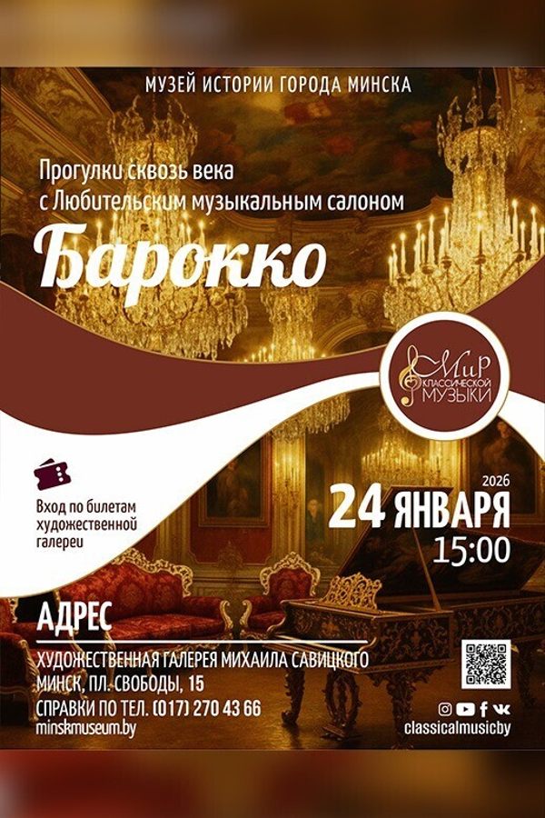 24 января 2025 года в 15:00 в Художественной галерее Михаила Савицкого состоится концерт «Прогулки сквозь века: Барокко» в исполнении музыкантов «Любительского музыкального салона «Мир классической музыки».