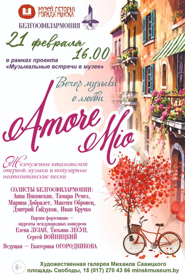 21 февраля 2026 г. в 16:00 Художественная галерея Михаила Савицкого и Белорусская государственная филармония в рамках проекта «Музыкальные встречи в музее» приглашают на вечер итальянской музыки о любви «Amore mio».
