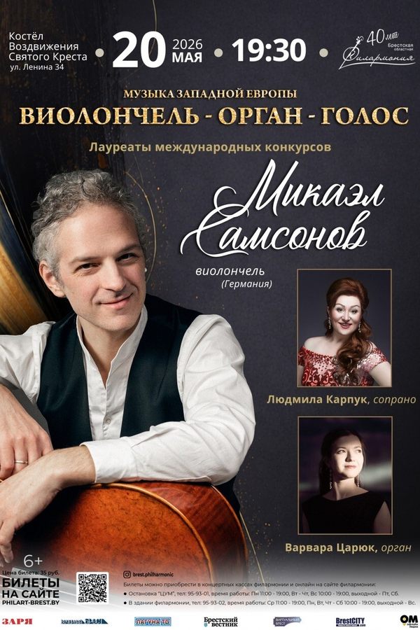 Изысканная концертная программа в тандеме с мастерами сцены: виолончель — Микаэл Самсонов (Германия), орган — Варвара Царюк (Минск), сопрано — Людмила Карпук (Брест).