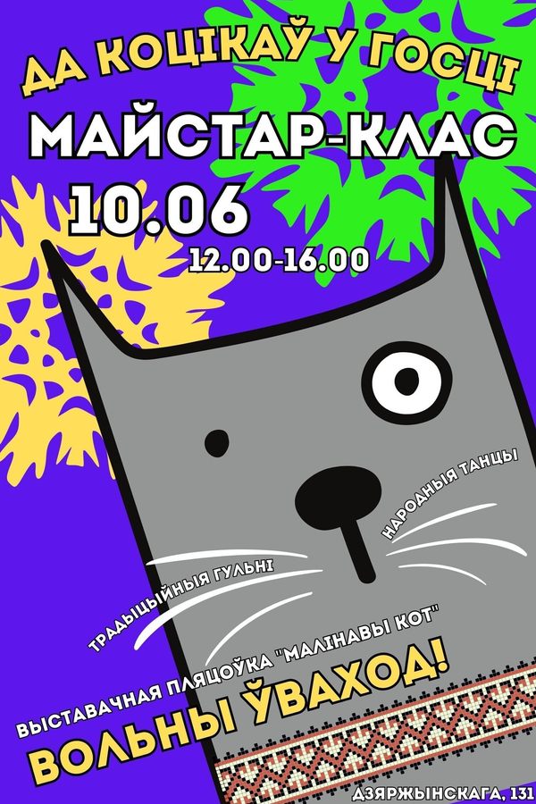 Майстар-клас будзе праходзіць на выставачнай пляцоўцы «Малінавы кот» 10.06.2023 з 12:00 да 16:00.