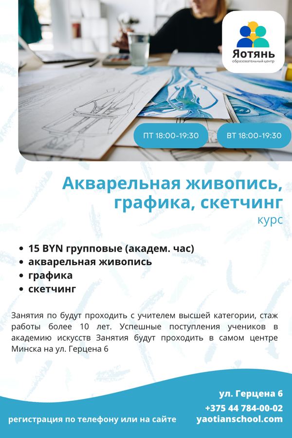 Занятия по будут проходить с учителем высшей категории, стаж работы более 10 лет. Успешные поступления учеников в академию искусств. Занятия будут проходить в центре Минска на ул. Герцена 6.