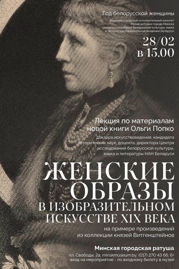 28 февраля 2026 года в 15:00 в Минской городской ратуше состоится лекция-презентация «Женские образы в изобразительном искусстве XIX века. На примере произведений из коллекции князей Витгенштейнов» по материалам новой книги доктора искусствоведения, кандидата исторических наук, доцента, директора Центра исследований белорусской культуры, языка и литературы Национальной академии наук Беларуси О.Н. Попко.