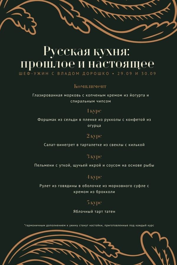 Все блюда взяты из книги рецептов 1909 г. и будут приготовлены в интерпретации шеф-повара ресторана.