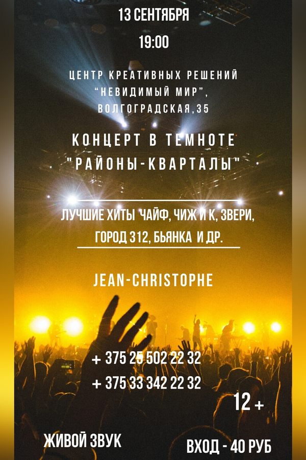 Центр креативных решений «Невидимый мир» приглашает вас на рок-концерт живой музыки «Районы-кварталы» в аранжировках кавер-группы «Jean-Christophe».