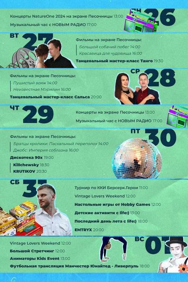 Песочники, последняя неделя августа! Давайте проведем ее активно вместе! Посмотрим фильмы на большом экране, оторвемся на дискотеке 90-ых, поучаствуем в чемпионате по настольной игре и просто отдохнем!