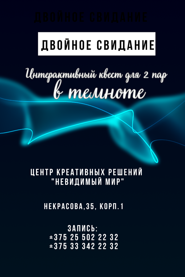 «Двойное свидание» — соревновательный квест для пар или друзей. Подойдет для тех пар, которые состоят в романтических отношениях и хотят нестандартно провести вечер; или для тех, которые состоят в браке, но хотят испытать новые ощущения от совместного времяпрепровождения.
