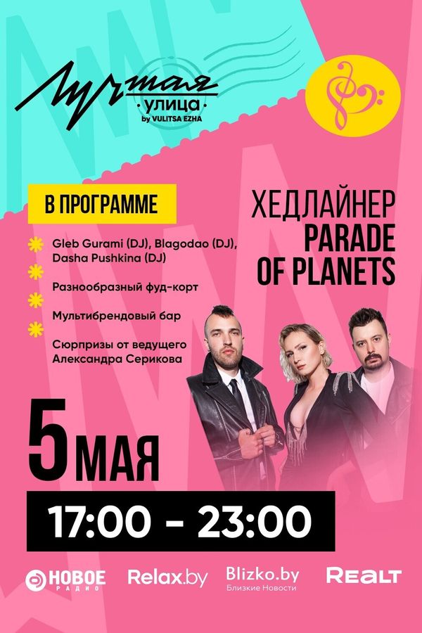 Уже в эту пятницу с 12.00 в Минске заработает гастрономическая площадка «Лучшая улица», а шумная программа открытия запланирована на вечер – с 17.00 до 23.00. Хедлайнером станет минская поп-группа Parade of Planets с модным танцевальным трек-листом на французском языке. Рассказываем, что будет в программе открытия 5 мая.