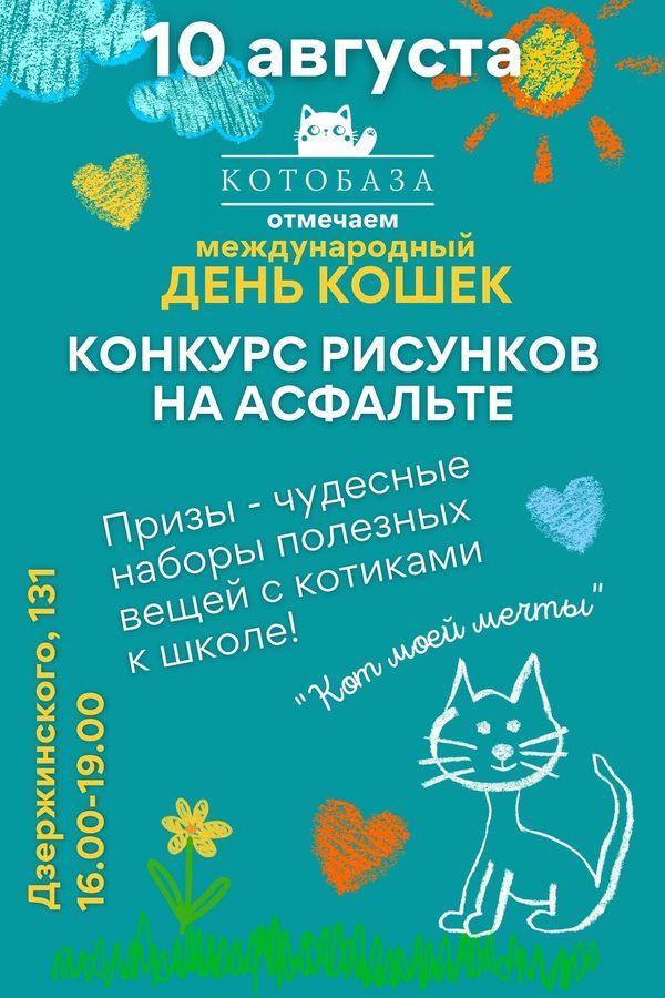 Волшебный магазин «Котобаза» с разнообразными кототоварами для людей и супервкусняшками для котиков приглашает поучаствовать в конкурсе рисунков на асфальте «Кот моей мечты», приуроченном к «Международному Дню кошек»!