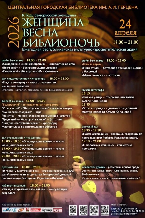Центральная городская библиотека им. А. И. Герцена представляет программу 13-й ежегодной республиканской культурно-просветительской акции «Библионочь-2026 «Женщина. Весна. Библионочь»