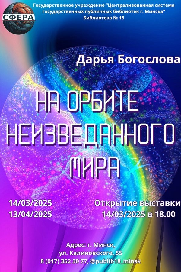 С 14 марта 2025 года в арт-галерее «Сфера» библиотеки № 18 начнет работу выставка живописи художника Дарьи Богослова «На орбите Неизведанного мира».