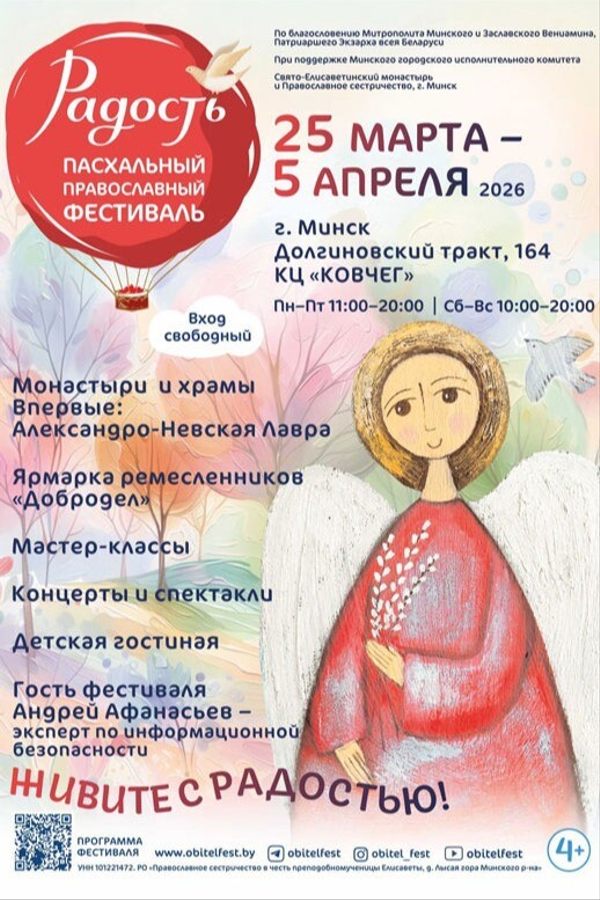 В Минске с 25 марта по 5 апреля 2026 года в духовно-просветительском центре «Ковчег» Свято-Елисаветинского монастыря (Долгиновский тракт, д. 164) пройдет Пасхальный православный фестиваль «Радость». Мероприятие проводится по благословению Митрополита Минского и Заславского Вениамина, Патриаршего Экзарха всея Беларуси, при поддержке Минского городского исполнительного комитета. Организаторы — Свято-Елисаветинский монастырь и Православное сестричество в честь преподобномученицы великой княгини Елисаветы, г. Минск.