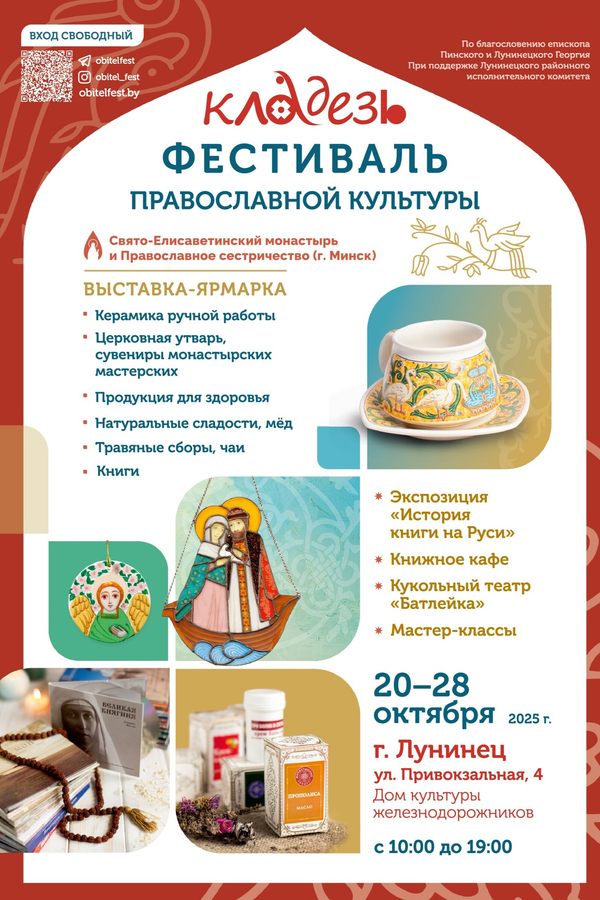 Сестричество Свято-Елисаветинского монастыря приглашает жителей и гостей Лунинца на фестиваль православной культуры «Кладезь». Мероприятие пройдет с 20 по 28 октября 2025 года в Доме культуры Железнодорожников по адресу: г. Лунинец, ул. Привокзальная, 4.