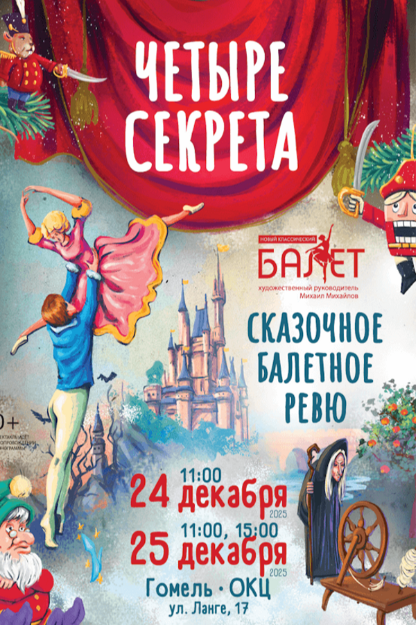 Фрагменты классических балетов «Спящая красавица», «Белоснежка и семь гномов», «Золушка» и «Щелкунчик», объединённые в один сюжет. Ревю (франц. revue) — эстрадное или театральное представление из отдельных сцен, номеров, объединённых между собой общей темой. Как быть, если хочется стать настоящей принцессой? Что делать, если мечты никак не сбываются? Выход в этой непростой ситуации — спросить совета у бабушки! Бабушка все знает и умеет, она сама когда-то была и Белоснежкой, и Золушкой, и даже Спящей красавицей! Она хранит невероятное количество секретов и некоторые из них обязательно расскажет своей любимой внучке! «Четыре секрета» — прекрасное погружение в мир балета и сказки!
