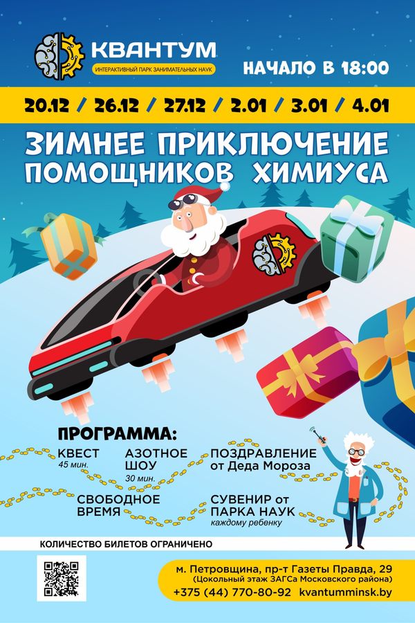 Новый год приближается и парк наук «Квантум» приготовил для юных гостей захватывающую программу «Зимнее приключение помощников Химиуса»!