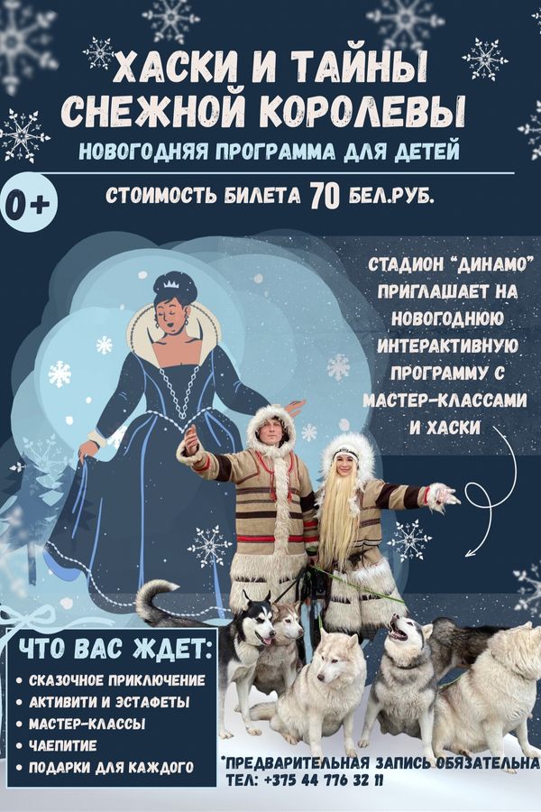 С 10 по 22 декабря на стадионе «Динамо» в Минске развернется новогодняя интерактивная программа (мастер-класс) для детей «Хаски и тайны снежной королевы». Это не просто праздник, а зимнее приключение, где дети вместе с настоящими хаски отправляются в путешествие по ледяному царству Снежной Королевы. Она приглашает юных гостей раскрыть тайны своего волшебного мира и пройти испытания, чтобы доказать силу дружбы, смекалки и доброты. На мастер-классах дети смогут создать и забрать с собой новогодний сувенир, который надолго сохранит память о приключении!