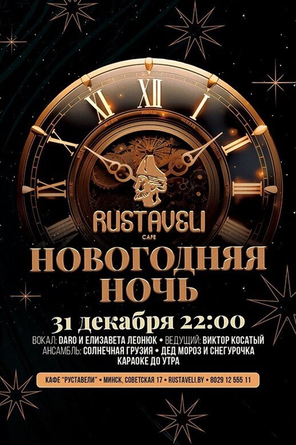 Отпразднуем Новый год вместе с кафе Руставели, где царит праздник! Великолепная кухня, шоу-программа от нашего ведущего под живую музыку, а Дед Мороз и Снегурочка добавят волшебства! И на десерт — караоке программа, которая подарит возможность весело провести время до самого утра! Ждём вас на праздник в центре нашей страны!