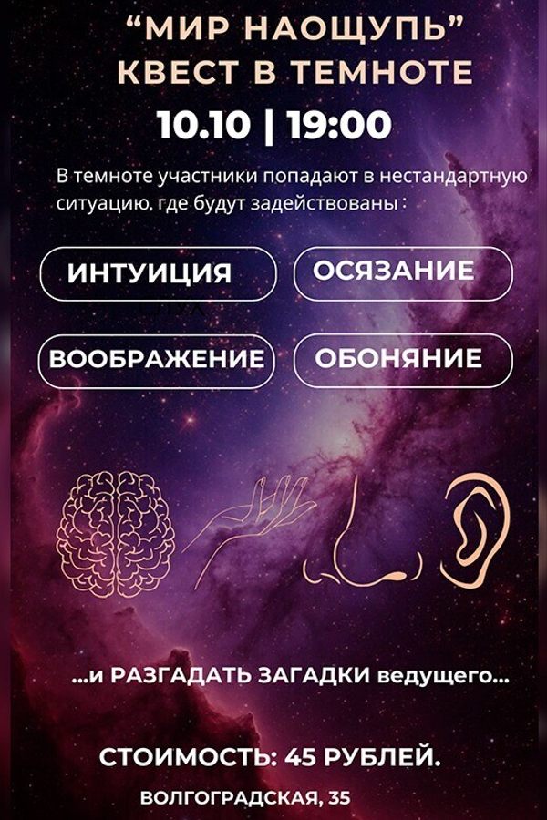 Посетили семьей квест ‘Мир на ощупь’. И взрослые, и дети (12 и 9,5 лет) остались в полном восхищении! Получилось понять, на какие из органов чувств можно положиться, а какие немного ‘спят’. Задания вовлекают каждого игрока в совместную работу, и в итоге их выполнение проходит весело и в большинстве своем - успешно. Отдельная благодарность ведущему Александру: очень приятное и деликатное сопровождение!