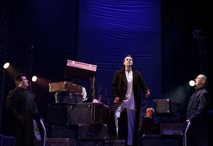В спектакле пересекаются эпохи, времена и судьбы, но главным остаётся история Песняра, который ищет Её.