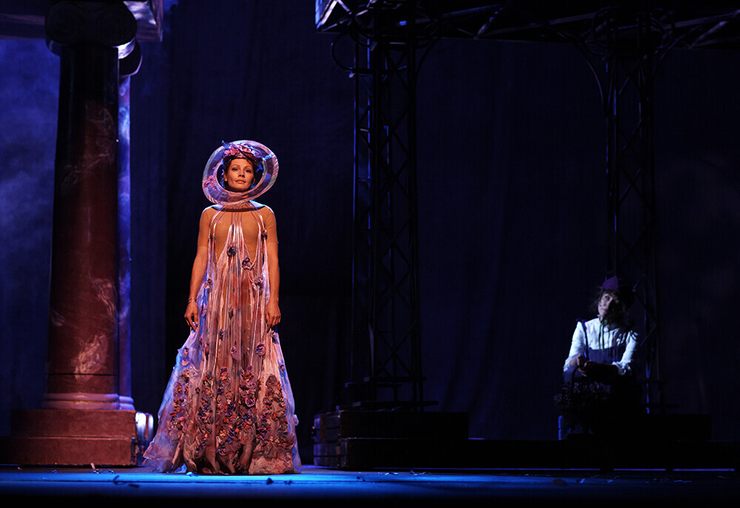 В спектакле «Пигмалион» два визуальных ряда, два пространства, два мира. Один — лондонские серые улицы и грязные подворотни, где обитает Элиза. И рядом другой мир — яркого теплого света, уютных светских гостиных, легких разговоров и изящных нарядов. Это дом профессора фонетики Генри Хиггинса и комната для приема гостей в доме миссис Хиггинс. Там, среди мраморных колонн, грациозных кушеток и мягких пуфиков течет непринужденная беседа о причудах погоды, и сверкают драгоценные камни.