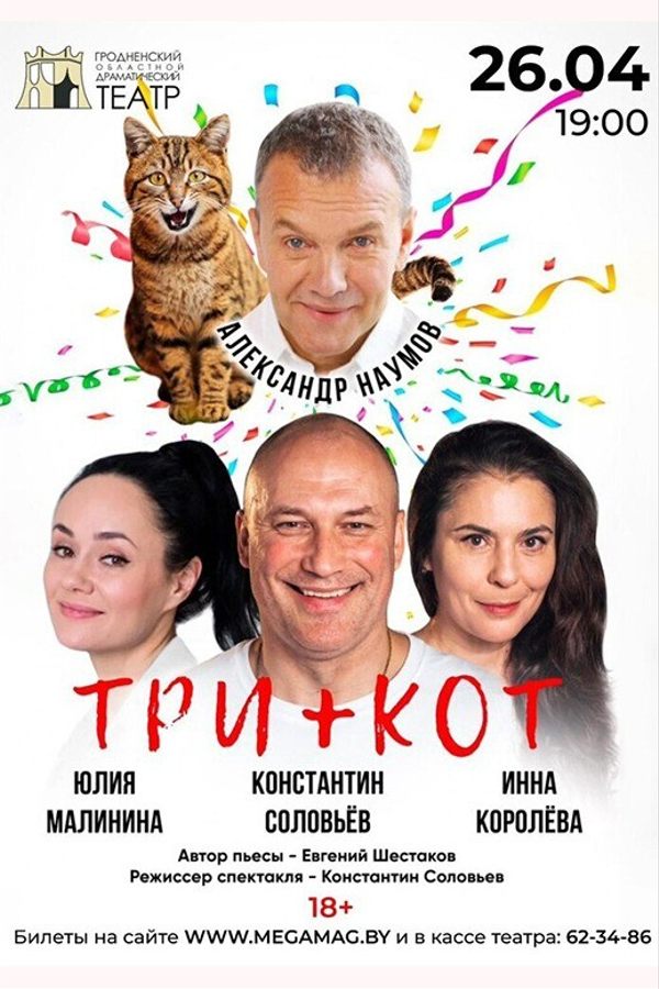 «Три + кот» — комедийная история о людях, которые вроде бы взрослые, самостоятельные… но запутавшиеся в чувствах. Это спектакль не про громкие события, а про тонкие движения души.